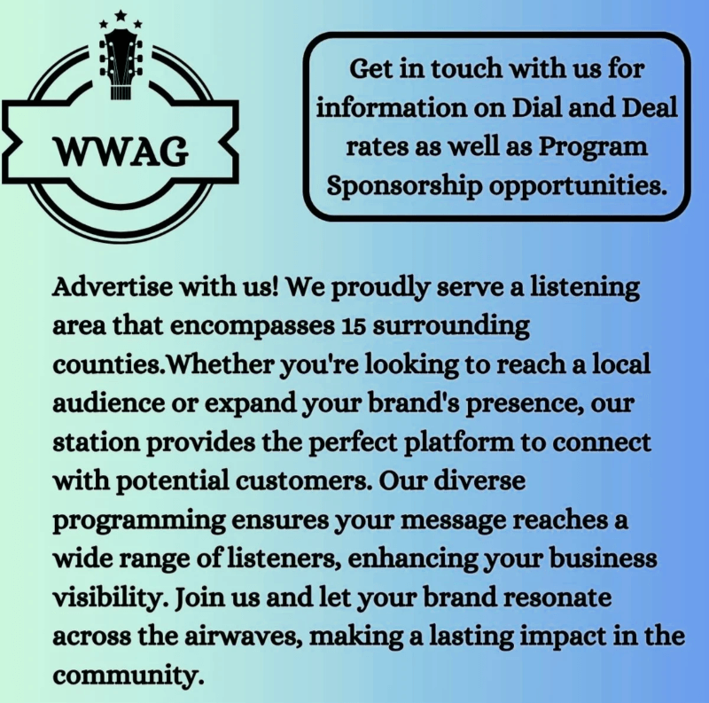 We proudly cover a listening area that includes 15 surrounding counties. Whether you want to connect with a local audience or expand your business reach, WWAG provides the ideal platform to engage potential customers. Our advertising ensures that your message reaches a varied audience, enhancing your business visibility. Join us and allow your brand to resonate across the airwaves, making a meaningful impact in the community. For more information and to request a rate sheet, please reach out to us at 606-287-9924 or britestarradio@yahoo.com.